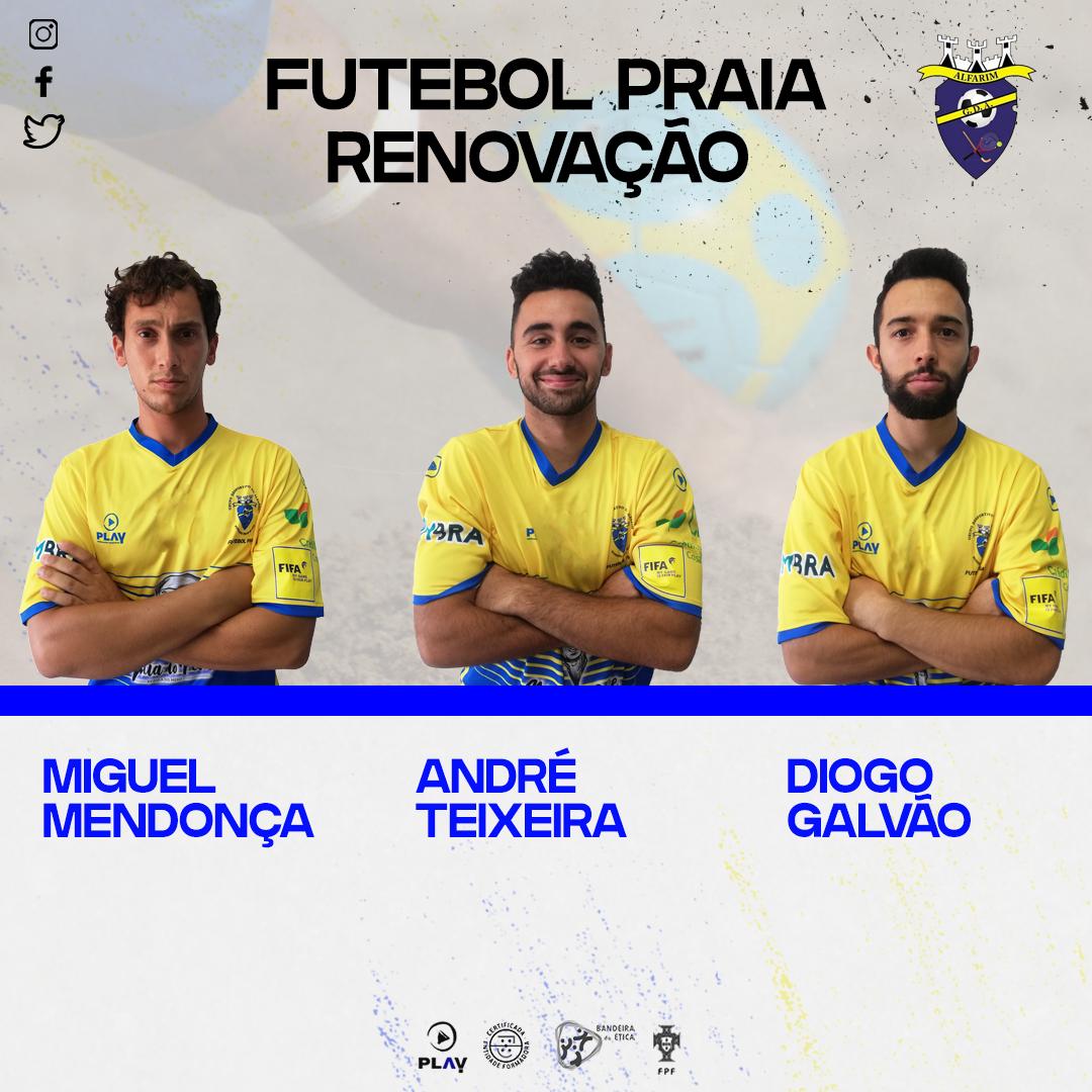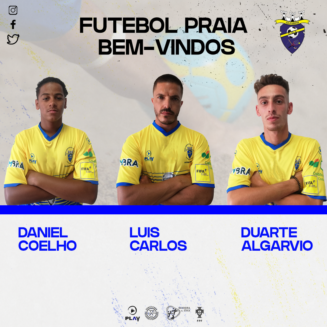 O GD Alfarim vem por este meio apresenta os atletas Fernando Veríssimo, Nuno Martins, e Ivo Mendes que vão fazer parte da nossa equipa da modalidade de futebol de praia para a época 2020. Aos três desejamos os maiores sucessos.