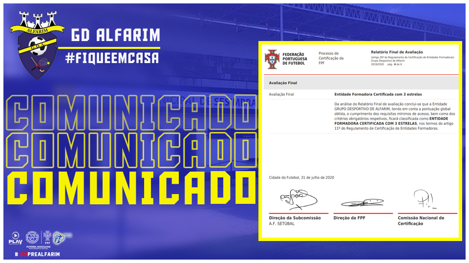 O Grupo Desportivo da Alfarim está de parabéns pela sua classificação de Entidade Formadora Certificada com 3 estrelas, somando 80,25 pontos em 100, conforme classificação hoje emitida pela Federação Portuguesa de Futebol, no seu Relatório Final de Avaliação. Não podemos deixar de nos sentir orgulhosos pela classificação obtida em relação á época anterior. Em apenas 2 anos o Grupo Desportivo de Alfarim passou de Centro Básico de Formação para Entidade Formadora Certificada 3 Estrelas. Somos uma vez mais uma referência na formação de jovens, distinguida pelo cumprimento dos 9 critérios de avaliação, motivo de orgulho para todos os sócios e simpatizantes do nosso Clube.