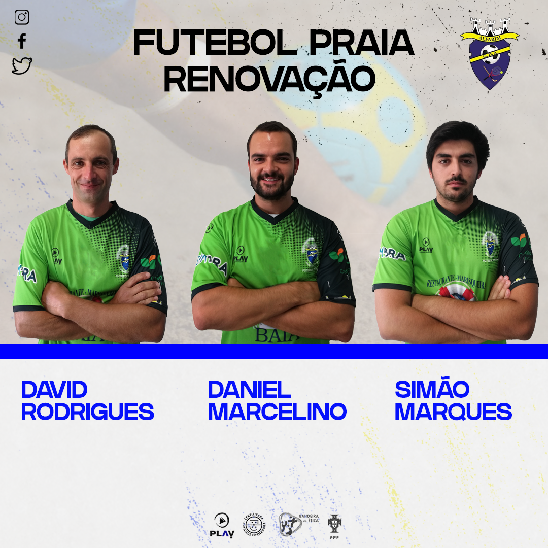 O GD Alfarim vem por este meio apresenta os atletas David Rodrigues, Daniel Marcelino, e Simão Marques que vão fazer parte da nossa equipa da modalidade de futebol de praia para a época 2020. Aos três desejamos os maiores sucessos.